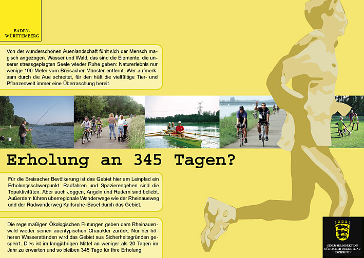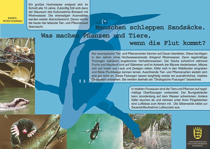 Mit den dafür notwendigen Flutungen beschäftigt sich der Rundweg durch das Kulturwehr Breisach. Dabei zeigen 13 lebendig gestaltete Infotafeln, was sich für Mensch, Tier- und Pflanzenwelt verändern wird.